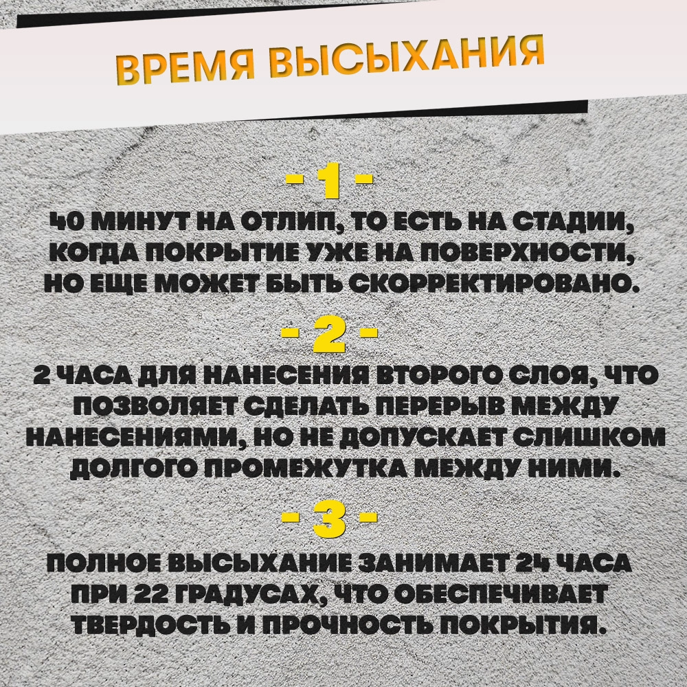 Время высыхания первого слоя составляет 40 минут на отлип. Второй слой можно наносить через 2 часа после нанесения первого слоя. Полное высыхание жидкой теплоизоляционной штукатурки при комнатной температуре 22 градуса и нормальном атмосферном давлении (762 мм рт. ст.) занимает около 24 часов.